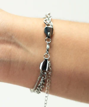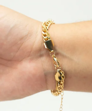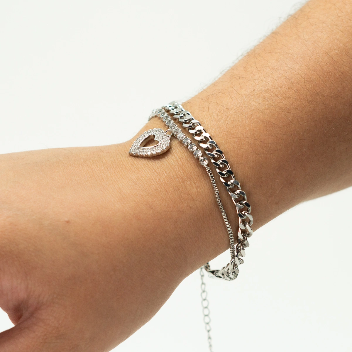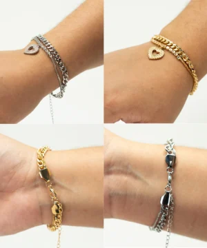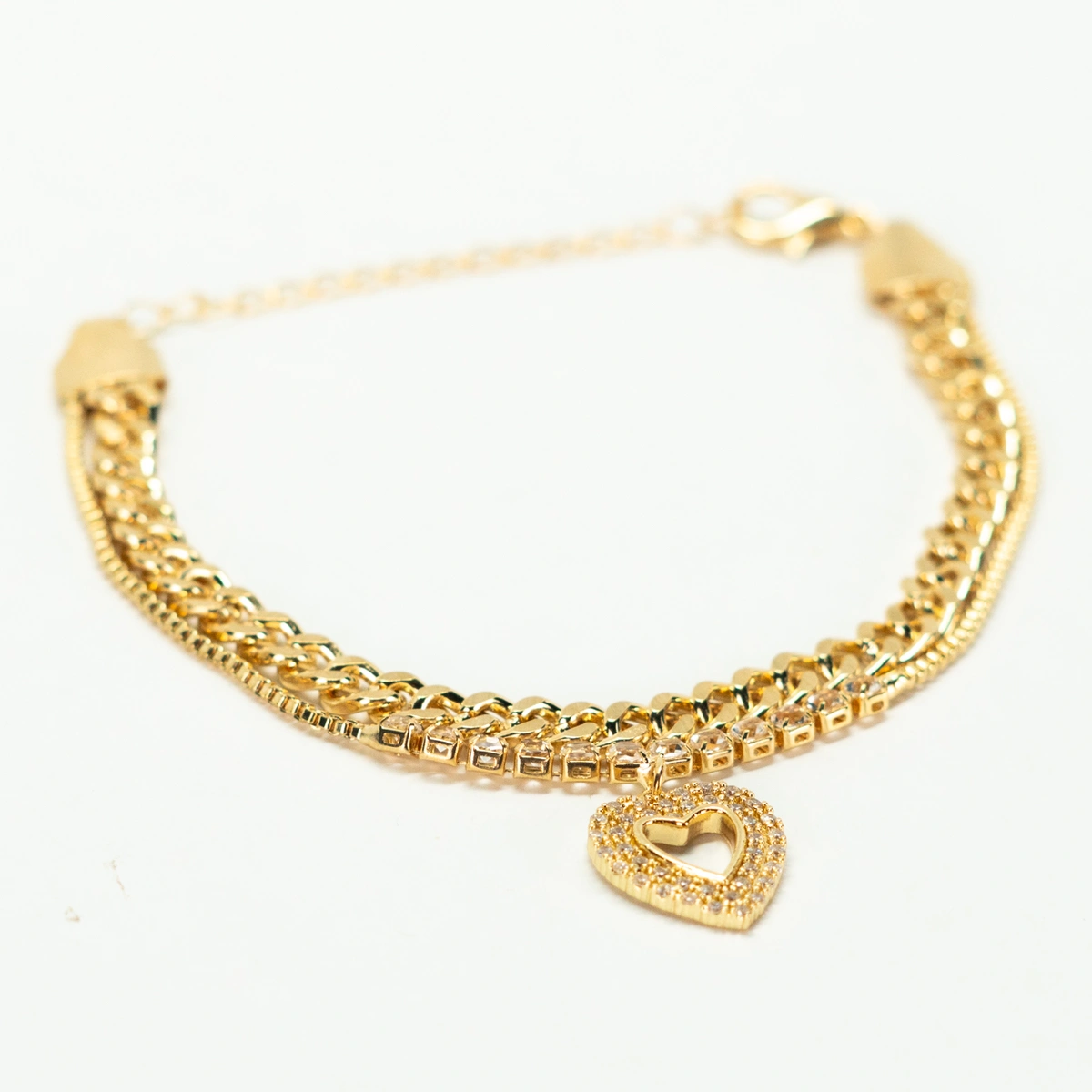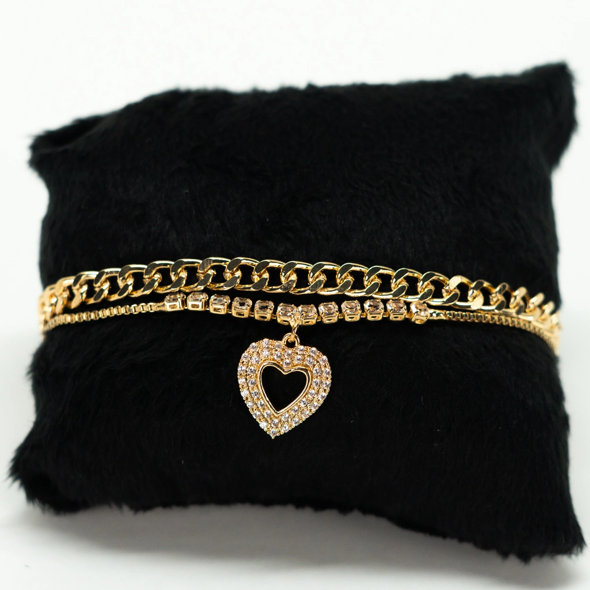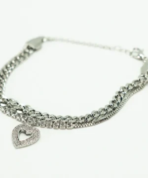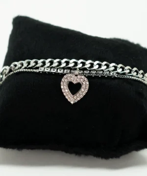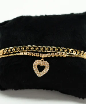 Exiba sua elegância com esta deslumbrante pulseira cravejada em formato de coração, um acessório que combina delicadeza e sofisticação em cada detalhe.